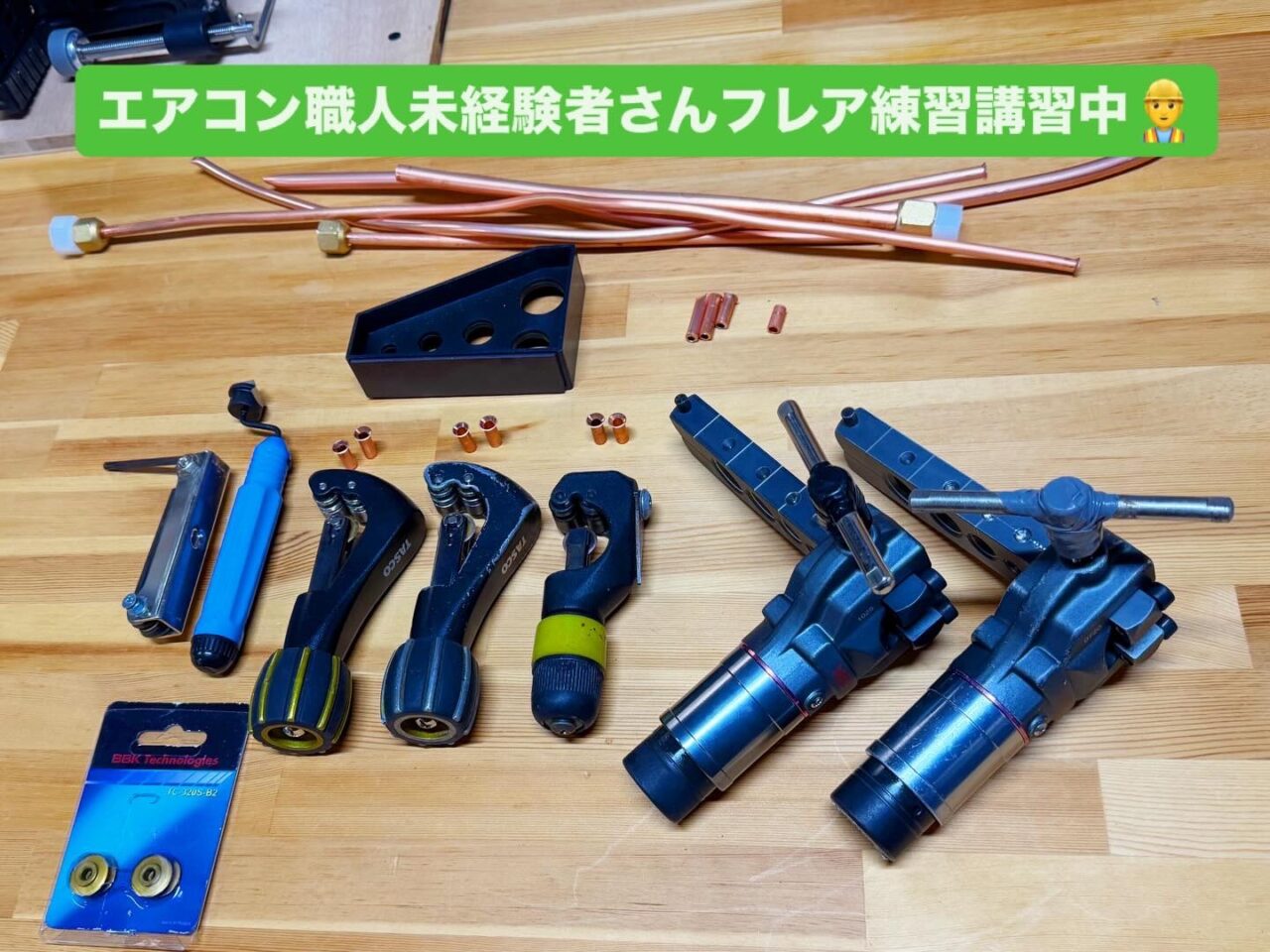 滋賀県彦根市(株)K-TECH本社にて新人研修エアコン穴あけ、銅管フレア加工の研修